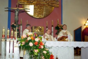 Centralnym wydarzeniem była wieczorna suma odpustowa. Koncelebrowali ją: ks. Prałat Jan Mrowca który przewodniczył liturgicznemu zgromadzeniu, ks. proboszcz Jerzy Serwin oraz ks. Marcin Masłoń, obecnie pracujący jako notariusz w Kurii Metropolitalnej nasz były wikariusz. Słowo Boże, na wszystkich Mszach świętych głosił ks. Marcin.