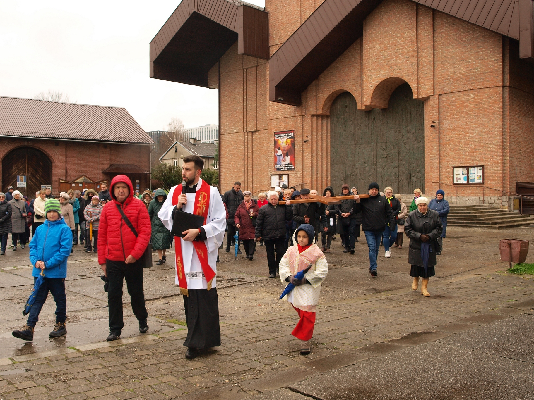 W Palmową Niedzielę, na ulicach naszej parafii, po raz 24. miało miejsce nabożeństwo Drogi Krzyżowej. Niedziela 2 kwietnia – 18 rocznica śmierci św. Jana Pawła II i odbywający się w tym dniu marsz poparcia i oddania czci największemu z rodu Polaków po haniebnych atakach niektórych środowisk na jego osobę, oraz pogoda, która nie zachęcała do wyjścia z domu, gdyż było wietrznie, mokro i zimno – to wszystko powodowało, że przed naszą świątynią zgromadziło się nieduże grono – ok. 60 wiernych. Później w trakcie Drogi Krzyżowej doszło jeszcze trochę osób, jednak ich ilość nie przekroczyła liczby 80 – 90.