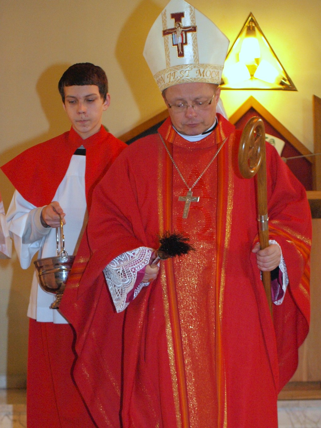 Prześladowany Jan pytając Chrystusa, jak ma w zaistniałej sytuacji postępować, otrzymuje odpowiedź: „Nie lękaj się!”  – a taka odpowiedź przychodzi wraz z Duchem Świętym. Rozwijając dzieje Kościoła począwszy od czasów starożytnych, ks. Biskup przedstawił obrazy wielu męczenników za wiarę: św. Klemens, św. Polikarp, św. Cecylia, czy bliższy naszym czasom, męczennik angielski z XVI w. Tomasz More. Wszyscy oni przyjmowali śmierć za wiarę ze spokojem. Wcale nie oznaczało to, że wyznawcy Chrystusa dobrowolnie szukali takiej śmierci, gdyż  chrześcijanie, jak każdy normalny człowiek, chcieli żyć. Jednakże w obliczu wyboru: wierność Jezusowi, czy zaparcie się Jego, wspomniani męczennicy, wybierali Jezusa, choć za to groziły tortury i śmierć. Co tym ludziom dawało siłę, aby dokonać  takiego wyboru – zapytał kaznodzieja i odpowiedział: Duch Święty. Męstwo nie polega na ryzykanctwu, kpinie, chojractwu. Chrystus w widzeniu św. Jana mówi o sobie: Jestem Pierwszy i Ostatni. To On, poprzez chrzest, był na początku waszego życia. I chociaż, w związku z wyznawaniem chrześcijańskich zasad,  spotkacie się różnymi sytuacjami, często trudnymi, a nawet dramatycznymi, to ostatnie słowa zawsze będzie należeć do Chrystusa. On nie traci kontroli nad światem. I ten, kto to wie, ma w sobie pokój, a wiedza ta pochodzi od Ducha Świętego, który przekazuje ją wraz ze swoimi Darami. Bierzmowanie umacnia do wyznawania wiary, a męczeństwo to radykalny sposób jej wyznania, choć nie jedyny. Kończąc kaznodzieja życzył, by przystępujący do sakramentu bierzmowania przyjęli Ducha Świętego i współpracując z Nim umieli wyznać swoją wiarę, gdyż to On wyzwala nas z lęku.