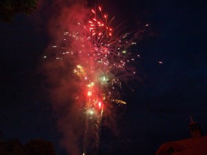 Zakończenie II Spotkań Świętojańskich było bardzo mocne i wręcz wybuchowe: pokaz fajerwerków. Wieczorne i ciemne już niebo zapłonęło nagle ognistymi kwiatami, bukietami i girlandami. Wspaniale wyglądała nasza świątynia w feerii barwnych fantastycznych świetlnych smug, gwiazd, gwiazdek, iskier.